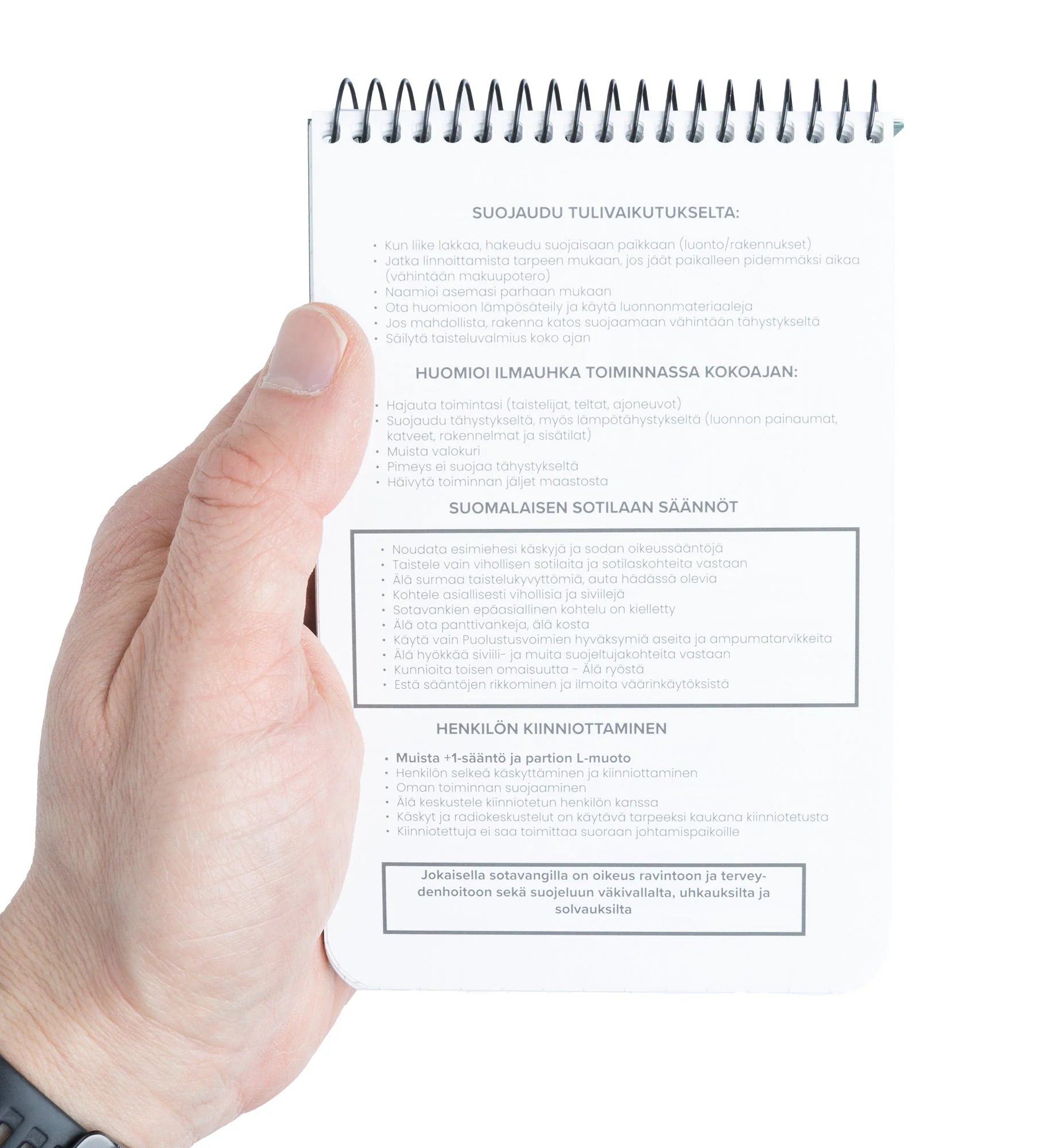 Tästä inttiin lähteville ja reserviläisille erinomainen old school -sovellus ruppaisiin olosuhteisiin, joissa tavallinen paperi muuttuu muhjuksi. Mighty Finlandin kanssa kehitetty ja Suomessa kivipaperista valmistettu vedenkestävä muistivihko, jossa on lisäksi paljon sotilaselämää helpottavia mittataulukoita, muistisääntöjä ja muita ohjeita. Mahtuu kätevästi vaikka reisitaskuun.