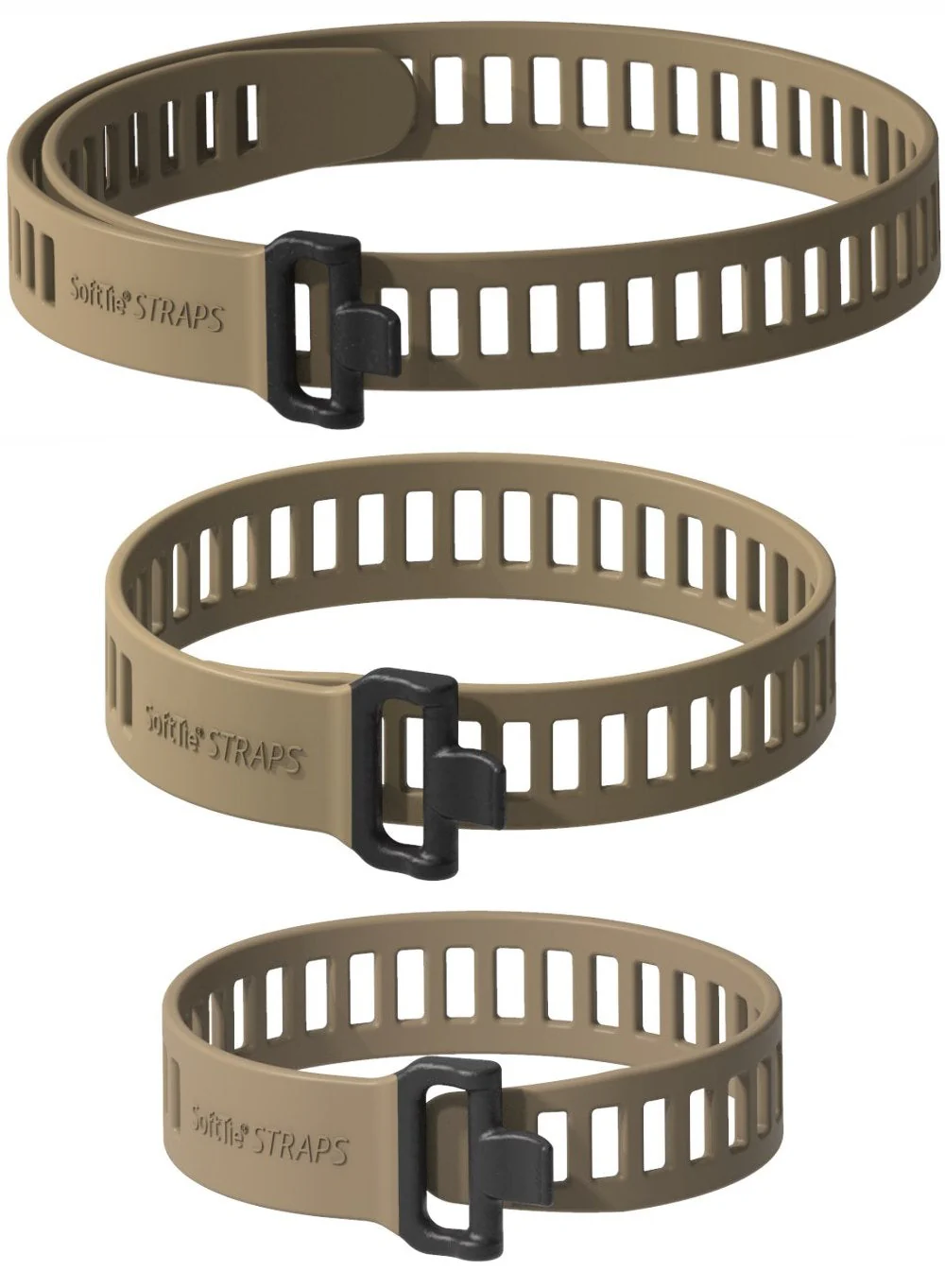 SoftTie on joustavaa materiaalia. Ei kuitenkaan kuminyörin tai joustonarun tapaan, vaan remmiä saa kiskoa ihan huolella venyttääkseen sitä edes vähän. Tämä tuottaa tavaroiden sidontaan esijännityksen, jonka turvin ne pysyvät aloillaan vähän huonompilaatuisiakin teitä kulkiessa.