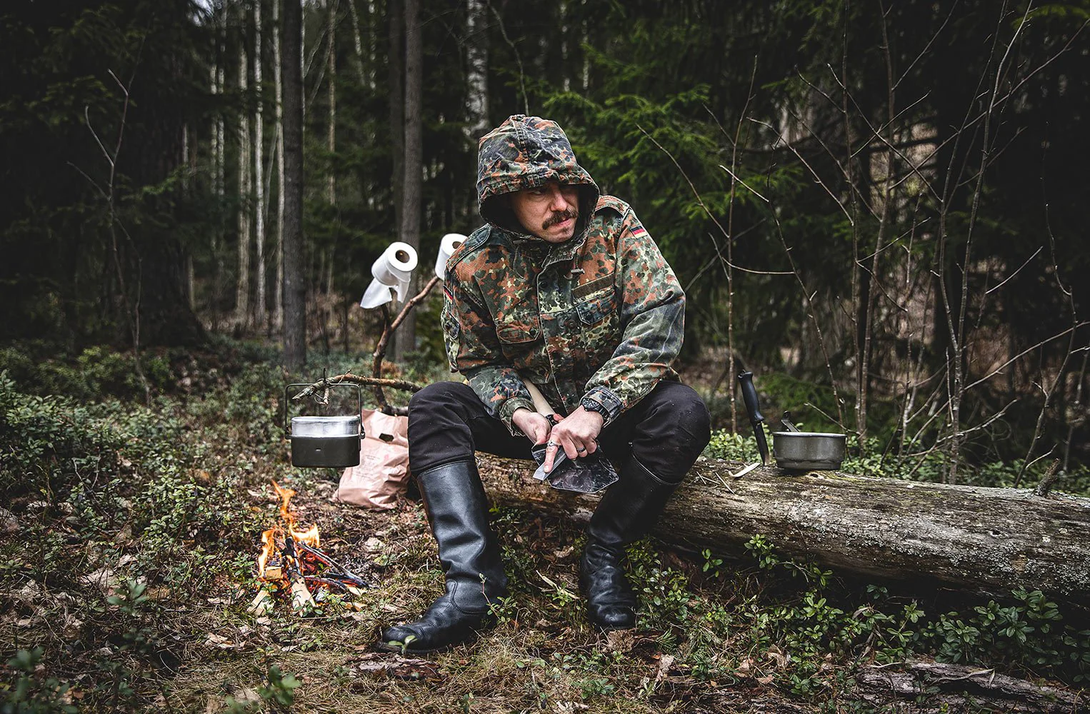 Jääkäripuukko 110 on erinomainen yleispuukko oikeastaan ihan kaikkeen käyttöön, parhaimmillaan jos kaverina on esim. kirves tai Skrama. Kunnollinen hiiliteräs, perinteinen suomalainen teräprofiili kevyellä "drop pointilla". Tämä ei ole mikään koriste-esine vaan rehelliseen käyttöön tehty työkalu. Jääkäripuukkoa saa useammassa pituudessa. Tsekkaa myös ne muut!