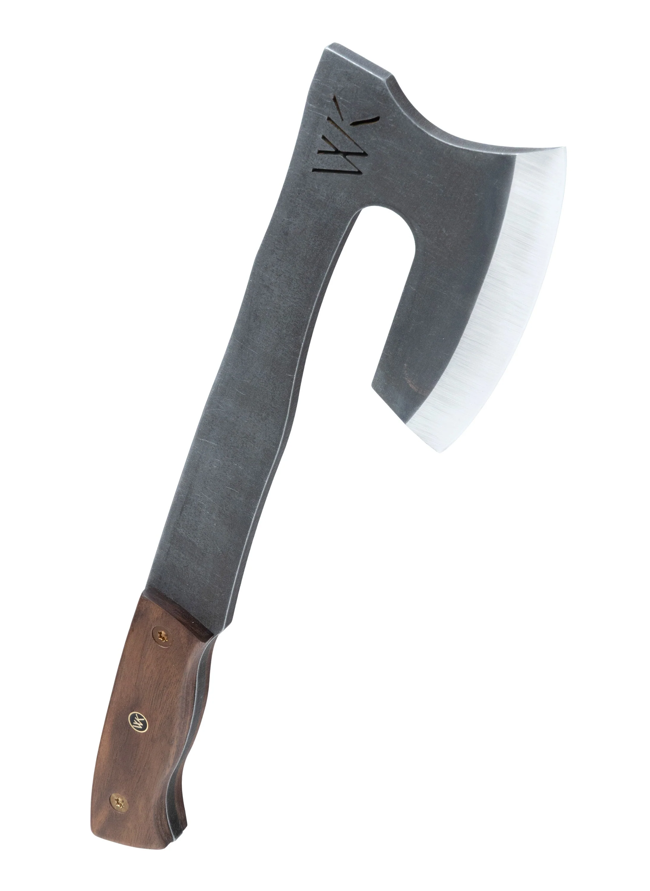 Näppäränkokoinen retkikirves erittäin kestävällä terällä ja full tang -pähkinäpuukahvalla. Mukana nahkainen teräsuojus nepparisululla.